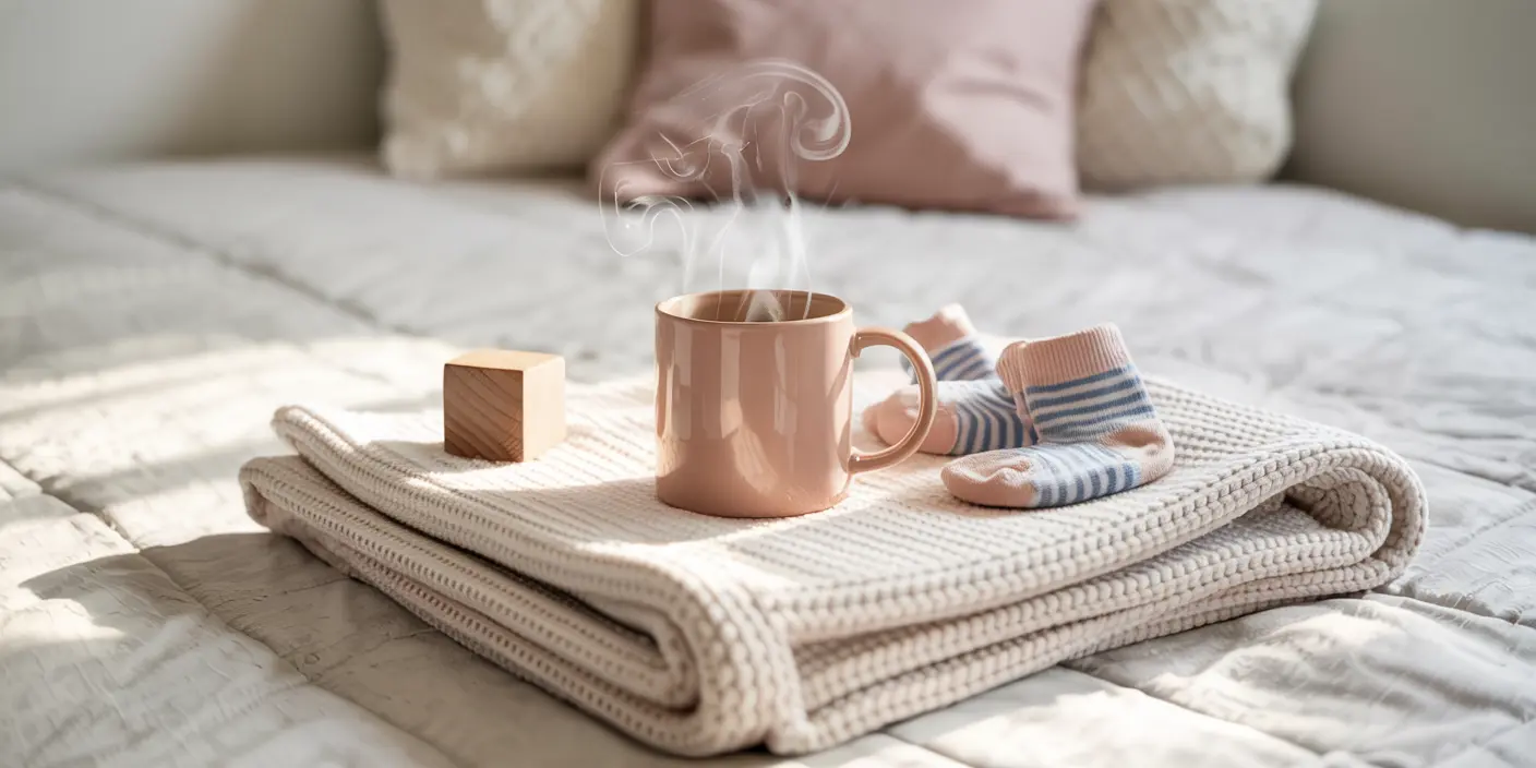 A tired mom enjoying a quiet cup of tea in cozy pajamas, surrounded by books and plants — a peaceful moment that reflects simple self-care ideas for moms.